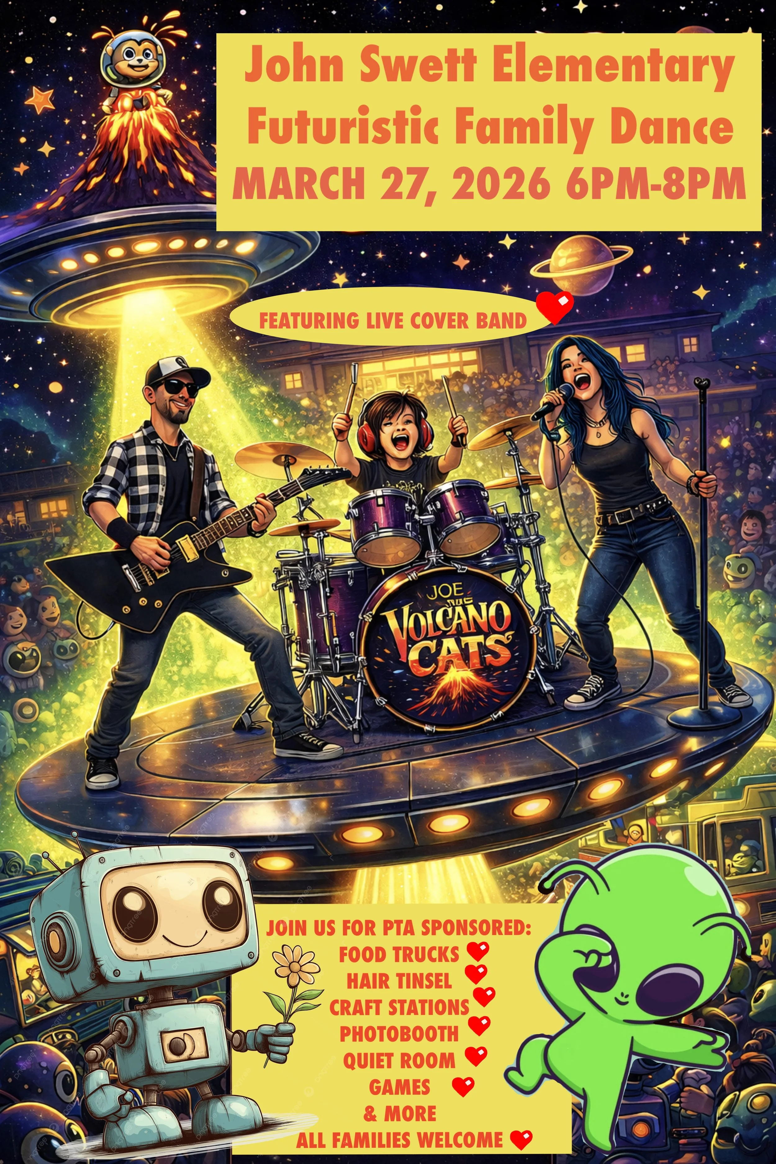 The PTA is excited to invite you to THE FUTURISTIC FAMILY DANCE. Please join us on March 27th, 2026 from 6-8pm in the Multi-Purpose Room for some dancing robots and aliens! This year we will also have a LIVE cover band playing on the stage. They are a local band called THE VOLCANO CATS and their drummer is seven years old from Oakland Unified School District. They are amazing and we are sure to have a fun time. Besides dancing, we will have a craft station, hair tinsel, games, food trucks and a quiet room for kiddos who need some sensory detox. We are also looking for wonderful JSE parents, guardians, grandparents, siblings, etc. who can volunteer to help set this up and tear it down. It takes a village and we want to show JSE kids a great time, so please sign up to help out if you can. Mark your calendars…March 27th will be here before you know it. Thank you and please contact me if you have any questions.